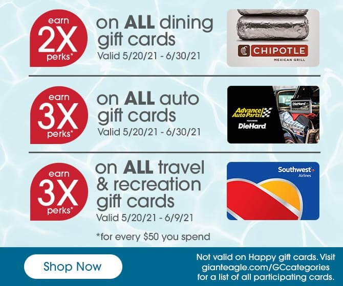 We have 3 gift card gallery offers today, good for discounts at giftcard.gianteagle.com and other retail websites.